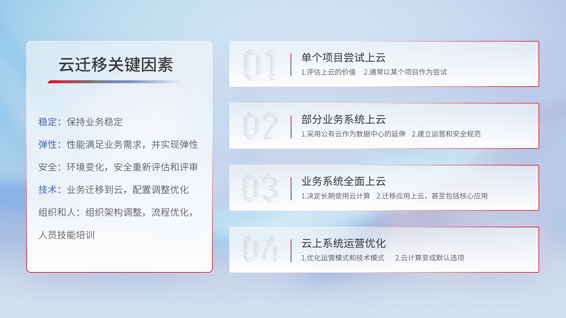 结合实际业务,,,从规划设计、、、云平台选型、、云原生改造、、、、数据迁移、、集成交付,,,迁移全过程为客户识别最佳上云路径,,,,做好风险识别管理,,设计网络架构、、、、身份权限、、、安全审计合规、、、操作审计、、、、日志审计、、监控告警策略、、、、多站点容灾设计等,,对云上基础设施进行整体规划,,,提升IT治理水平,,,以满足弹性、、高可用、、、高性能的需求。。。。